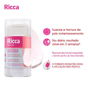 Bastão Ricca Facial Magic Stick Apaga Poros O bastão facial apaga-poros tem ação instantânea contra poros dilatados e textura irregular da pele, e o efeito é potencializado com o uso diário. A niaci