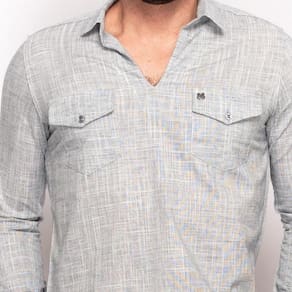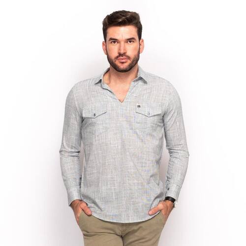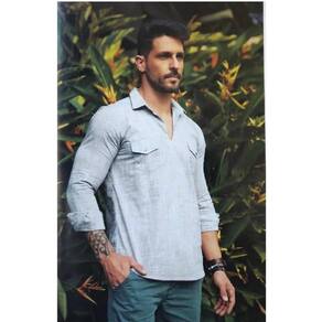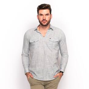 Bata manga longa em tecido flamé de algodão e linho, decote V e dois bolsos frontais com tampa. Botões personalizados, barra levemente arredondada e mangas mais justas, conferindo ar casual e moderno. Gola esportiva macia. Logo da marca em plaquinha de metal.