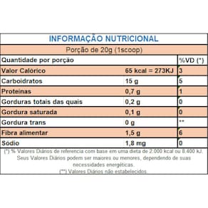 - 1Kg de suplemento representa 4Kg de Batata Doce. - 20g (1 scoop) equivale a 80g de Batata Doce. - Fonte de vitaminas e minerais. - Carboidrato de baixo índice glicêmico.