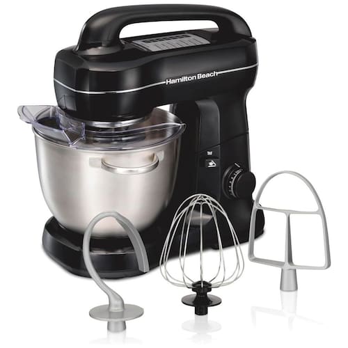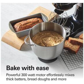 A batedeira Hamilton Beach Stand Mixer é perfeita para quem gosta de fazer produtos assados em casa. Com um potente motor de 300 watts, ela é capaz de lidar facilmente com ingredientes para massas grossas e massas para pães, cupcakes e biscoitos. A batedeira possui 7 velocidades, incluindo uma primeira velocidade mais lenta que ajuda a reduzir respingos e um guia de mistura útil na parte superior da batedeira que ajuda a escolher a velocidade certa para o trabalho. A cobertura completa da tigela permite uma mistura uniforme e completa com as mãos livres, graças à ação de mistura planetária que gira os batedores em torno da tigela de aço inoxidável de 3,73 litros. A batedeira vem com proteção contra respingos, gancho para massa, batedor e batedor plano, além de uma alça incorporada que facilita o levantamento, movimentação e armazenamento da batedeira. A tigela e os acessórios da batedeira podem ser lavados na máquina de lavar louça.