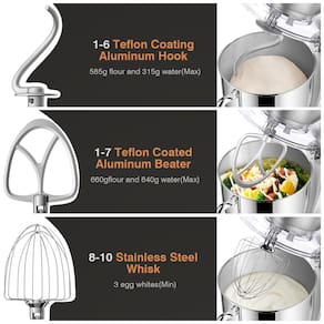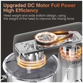 O sistema de motor DC atualizado com toda a estrutura de engrenagem de metal e caixa de engrenagens fechada reduz efetivamente o som e garante velocidade de funcionamento estável sem paradas, além de prolongar a vida útil da batedeira. O sistema de mistura planetário com mais pontos de contato por rotação durante o processo de mistura garante que toda a mistura seja agitada ao máximo.
