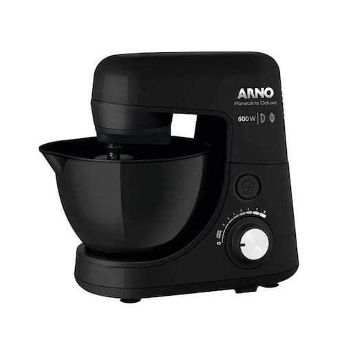 Batedeira Arno Planetária Nova Deluxe SX34 Preta 4,1 L 600W Cor: preto Voltagem: 110v Batedeira Elétrica Arno Planetária Nova Deluxe SX34 Preta Tigela 4,1 L 600W Tenha resultados perfeitos e sem incômodos com a Batedeira Arno Nova Deluxe São 600W de potência e 8 velocidades que podem ser aumentadas de forma gradativa, de acordo com a necessidade do preparo, além da função Início Suave, para misturar os ingredientes evitando desperdícios. Desenvolvida para oferecer o máximo de poder com o mínimo de ruído. Características Gerais: - Movimento Planetário: garante perfeita homogeneidade nas mais variadas receitas, resultando em misturas uniformes de maneira profissional;- Conta com 2 batedores: força e versatilidade para massas pesadas e leves; - Sem dificuldade para misturar ou bater massas mais densas;- Tigela de 4,1L com resistência térmica: pode ser levada diretamente ao freezer ou micro-ondas;- 8 velocidades: com função início suave;- Batedor de massas leves: o globo é ideal para incorporar ar nas receitas;- Batedor de massas pesadas: o gancho é eficiente no preparo de massas pesadas;- Função início suave: mistura os ingredientes de forma eficiente evitando respingos;- Até 2x mais rápida: garantindo mais eficiência e praticidade que uma batedeira comum;- Prepara massas leves: bolos, mousses, recheios, chantilly, claras em neve e similares;- Prepara massas pesadas: massas de pães, pizzas, pão de queijo e similares;- 600W de potência: força e versalidade para massas leves e pesadas;- Ideal para resultados rápidos e perfeitos;- Design moderno e inovador: desenvolvido na cor preta; Ficha Técnica: - Marca: Arno- Modelo: Planetária Nova Deluxe SX34- Cor: Preto- Potência: 600W- Peso aprox.: 3,2 Kg- Voltagem: 110V (Não é Bivolt)- Certificado INMETRO: OCP-0029 Garantia do Fabricante: 1 ano Conteúdo da Embalagem: - 01 UN Batedeira Arno Planetária Nova Deluxe SX34 Preta 600W- 01 UN Tigela 4,1L com Resistência Térmica- 02 UN Batedores- 01 UN Manual e Certificado de Garantia Acompanha nota fiscal e certificado de garantia válido em todo o País.