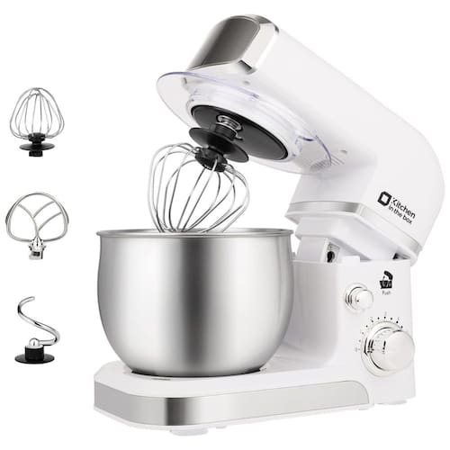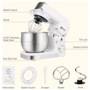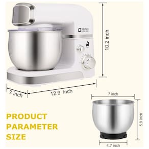 Capacidade de 3 litros e Design de Cabeça Inclinada Nossa pequena batedeira de cozinha equipada com tigela de aço inoxidável de 3 litros, adequada para s padeiros, família de 1 2 membros ou casais, fácil de operar e limpar. desinstale a tigela e os acessórios facilmente. E a tampa anti respingo transparente pode impedir que o ingrediente faça uma bagunça.