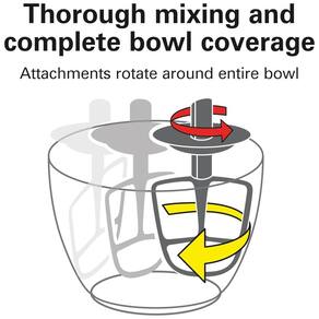 MISTURA COMPLETA E COBERTURA COMPLETA DA BACIA. À medida que você mistura, cada acessório gira em torno de toda a tigela à medida que gira na velocidade selecionada. Essa ação de mistura planetária garante que os ingredientes sejam bem misturados e fornece cobertura completa da tigela.