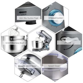 DESIGN DE CABEÇA INCLINADA E EXTERIOR O misturador de design de cabeça inclinada permite o acesso para instalar ou desinstalar tigela e acessórios facilmente. O misturador tem um cinto de decoração de aço inoxidável e luz LED azul como indicador de energia. Com certeza um dos melhores eletrodomésticos da sua cozinha..