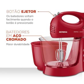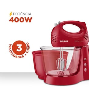 A batedeira Prática Due Black B-45-R Vermelha tem 400W de potência, vem com 2 tigelas (3.6L e 2.3L), tem 3 velocidades, função turbo e batedores de aço cromado: performance, praticidade, e versatilidade para massas, bolos e receitas! A Due Red traz o melhor resultado nas receitas do dia a dia, sejam bolos de chocolate, fubá, ou massas. Vem com 2 tigelas, uma maior de 3,6L (litros) e uma menor, de 2,3L (litros): prepare mais de uma receita com muitos ingredientes. Tem 3 velocidades e também função turbo, que aumenta o batimento, garantindo eficiência para suas receitas. Com o botão ejetor, os batedores (pás) soltam facilmente para limpeza, e o exclusivo sistema de fixação a faz mais prática de montar. Os batedores (pás) são de aço cromado, o que garante mais durabilidade e resistência. Alta performance para quem busca praticidade e precisão ao criar receitas especiais. Uso doméstico. 1 ano de garantia.