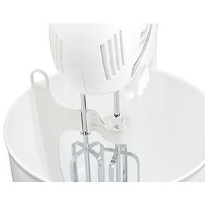 • Maior potência – 350W • 4 velocidades + botão Turbo • 2 tigelas em plástico com capacidade para 3L e 4L • 1 Par de batedores em aço inox para massas leves • Botão ejetor dos batedores • Unidade motora pode ser usada fora da base como portátil • Plataforma basculante • Acessórios: Tampa, espátula acoplada e peneira.