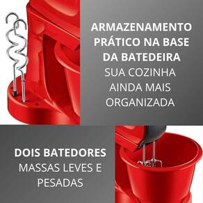 -Motor de 400 W: Um motor potente com o qual é possível preparar receitas complexas, como massas de pães. -Cinco velocidades + função turbo: Massa homogênea sem esforços! -Tigela plástica de 3,5 L: Atendendo a necessidade de diversas receitas! -Sistema FlexiMix: Alcança todos os cantos garantindo que toda massa seja incorporada sem a necessidade de ferramentas extras ou pausas para raspar as laterais. -Armazenamento prático para acessórios -Multiuso: Tigela removível -Projeto Ergonômico: Fácil de segurar, usar e controlar em uma mão. -Pedestal para batedeira e recipiente -Botão TURBO -Dois Batedores: Massas leves e pesadas