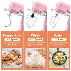O conjunto de acessórios inclui gancho para massas, batedor e fouet, cobrindo etapas de sova, mistura e aeração de ingredientes em diferentes densidades. O controle de velocidade por botão giratório, complementado pela função de pulso, facilita o ajuste entre agitação suave e mistura em alta rotação, adequado para incorporar ingredientes secos, bater claras e homogeneizar massas mais pesadas.