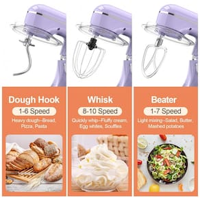 O conjunto de acessórios inclui gancho para massas, batedor e fouet, cobrindo etapas de sova, mistura e aeração de ingredientes em diferentes densidades. O controle de velocidade por botão giratório, complementado pela função de pulso, facilita o ajuste entre agitação suave e mistura em alta rotação, adequado para incorporar ingredientes secos, bater claras e homogeneizar massas mais pesadas.