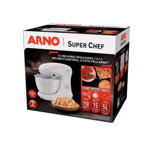 A melhor planetária já feita pela Arno com alta potência de 750W e 15 velocidades para resultados perfeitos e mais rápidos! Possui 1 tigela de 5L para o preparar até o dobro de uma receita além de ter resistência térmica - pode ser levada diretamente ao freezer ou micro-ondas! Design exclusivo, botão integrado multi velocidades + trava de abertura, tampa anti respingo que além de maior praticidade e menos sujeira, possui o bocal exclusivo com uma maior abertura para facilitar a inclusão de ingredientes. Completa, com 3 batedores - para massas pesadas, médias ou leves além do início supersuave que mistura os ingredientes de forma eficiente evitando respingos + função turbo alcance para claras em neve em até 1 minuto! Além disso, o batedor para massas leves fica mais rente à tigela permitindo bater apenas 1 clara em neve, garantindo um menor desperdício e otimização de receitas menores. É ainda mais estável na bancada graças ao design da base e fácil de limpar por ter áreas planas que evitam o acúmulo de sujeira. A Arno ainda oferece 2 anos de garantia! Batedeira Arno Superchef - você imagina, clic, a Arno faz!