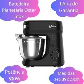 Batedeira Planetaria 850W De Potencia 12 Velocidades Partida Suave Tampa Transparente Anti Respingo 4L 127V 3 Batedores A Batedeira Planetária Oster Bowl Inox III é um novo modelo de batedeira que combina um corpo de inox e plástico com 850w de potência e 12 velocidades para oferecer um desempenho excepcional. A tigela inox de 4L é resistente a choques térmicos e tem uma circunferência de 66cm, permitindo que você prepare grandes quantidades de alimentos de uma só vez. Com três batedores diferentes - um para massas leves, outro para massas médias e outro para massas pesadas - você pode preparar receitas de todos os tipos com facilidade. A tampa medidora de 80ml facilita a adição de ingredientes durante o preparo. Os pés com ventosas garantem que a batedeira permaneça firme durante o uso, enquanto o design moderno torna-a uma adição elegante à sua cozinha. A função partida suave garante que a batedeira comece devagar antes de aumentar gradualmente a velocidade, evitando respingos e bagunças. A tampa transparente com abertura permite que você verifique o progresso do preparo sem precisar interromper o processo. Além disso, com um porta fio na base e um cabo com 104cm, a batedeira é fácil de usar, limpar e armazenar. Com um consumo de apenas 0,85kW/h e uma tomada de 10a de 2 pinos, você pode usá-la sem se preocupar com o aumento da conta de luz. Com todas essas características incríveis, esta batedeira é uma excelente escolha para quem busca qualidade e eficiência na hora de preparar receitas deliciosas em casa. Ela ainda possui 1 ano de garantia de fábrica para assistência técnica com o fabricante. Sobre o produto:- Marca: Oster- Modelo: OBAT641- Voltagem: 127V Não é bivolt - Cor: Preto e Prata- Registro Inmetro: SGS BRA21/01088- Medidas do produto A x L x P : 34 x 38 x 23 cm- Peso do produto: 3800 gramas Itens inclusos:1 - Batedeira Planetária1 - Tigela Inox de 4 litros1 - Batedor de claras em neve1 - Batedor de massas leves1 - Batedor de massas pesadas1 - Tampa Anti respingo1 - Medidor