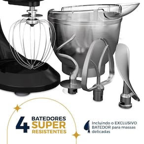 Acompanha três batedores de alto desempenho: um em inox para massas leves, um reforçado para massas pesadas e um em alumínio para claras em neve, tudo pensado para elevar o padrão das suas criações. A unidade é articulável, facilitando o manuseio e a troca dos batedores de forma prática.
