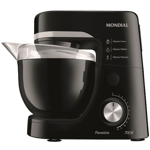 ? 700 W de potência: mais potência para preparar diversos tipos de massas, pães, cremes, chantilly e claras em neve; ? Tigela com 4,5 L de capacidade: prepara receitas com grande quantidade de ingredientes; ? 12 velocidades: possibilita a escolha ideal da velocidade, conforme o tipo de receita a ser preparada; ? 3 tipos de batedores: permite o preparo de massas leves, médias e pesadas; ? Sistema de abertura: prático manuseio dos batedores; ? Tampa antirrespingos: perfeita para adicionar ingredientes durante o preparo, evitando respingos.