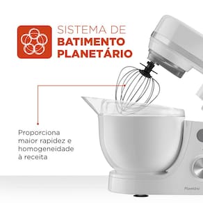 São até 3 batedores para diferentes tipos de massas, sejam leves, médias ou pesadas, graças ao sistema de movimento planetário, é possível ter ingredientes misturados de forma homogênea em pouco tempo e aproveitando ao máximo todos os espaços da tigela. Por falar na tigela, ela tem capacidade total para até 4,5L, para receitas de todos os tamanhos.
