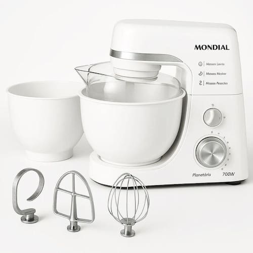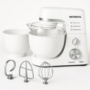 Descubra a potência e a elegância da Batedeira Planetária Mondial BP-03W-2B, perfeita para quem ama cozinhar com praticidade e alto desempenho. Com 700W de potência, ela é ideal para preparar desde bolos fofinhos até massas pesadas, como pães e pizzas.