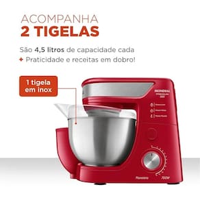 Itens Inclusos: 01 Batedeira Planetária; 01 Batedor de Massas Leves; 01 Batedor de Massas Médias; 01 Batedor de Massas Pesadas e 01 Manual de Instruções; 02 Tigelas de 4,5L.