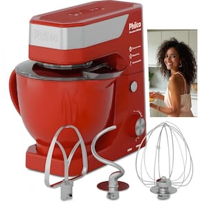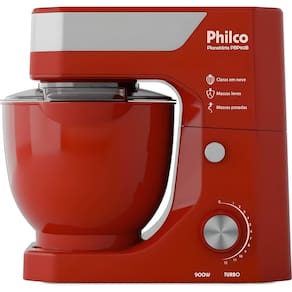 - **Marca**: Philco- **Modelo**: PBP90B- **Cor**: Vermelha- **Potência**: 900W- **Capacidade da Tigela**: 5L- **Velocidades**: 12 + turbo- **Tipo de Batedeira**: Planetária- **Garantia**: 12 meses- **Indicações de uso**:    - Massas pesadas (pães, pizzas, panetones)    - Bolos fofinhos e bem aerados    - Chantilly e claras em neve com textura ideal    - Receitas gourmet e profissionais    - Confeitaria caseira ou comercial