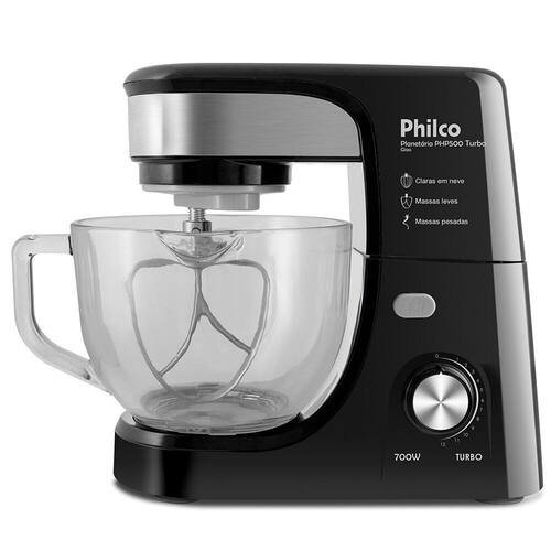 Caracteristicas: Marca: Philco Modelo: PHP500 Turbo Glass Potencia: 700W Capacidade da tigela: 4,00 litros Velocidades: 12 velocidades Botao de acionamento: para levantamento do corpo do produto Movimento: Planetario Batedores: 3 batedores: batedor para massas leves, batedor para massas pesadas e batedor para cremes e claras Tigela: Vidro com alca Tampa: Anti respingos Base: Antiderrapante Porta fio: Sim Unidade motora: Fixa