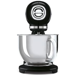 A batedeira planetária SMEG SMF03 possui tigela em aço inox com capacidade de 5 litros, motor de 600W e 10 velocidades, adequada para preparo de massas leves e pesadas em uso doméstico. O corpo em alumínio fundido com design retrô inspirado nos anos 50 reúne construção metálica robusta e acionamento por controle eletrônico de velocidade, com movimento planetário para mistura homogênea dos ingredientes.