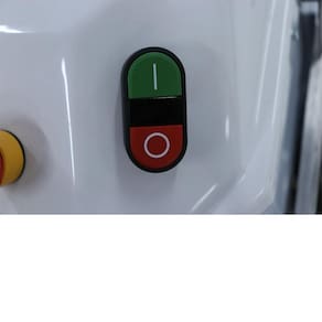 - Proteção móvel intertravada que impede o acesso à área do batedor e que ao ser aberta efetua a parada imediata com funcionamento através de duas chaves eletromecânicas com acionamento individual, atuando simultaneamente na proteção móvel evitando falhas