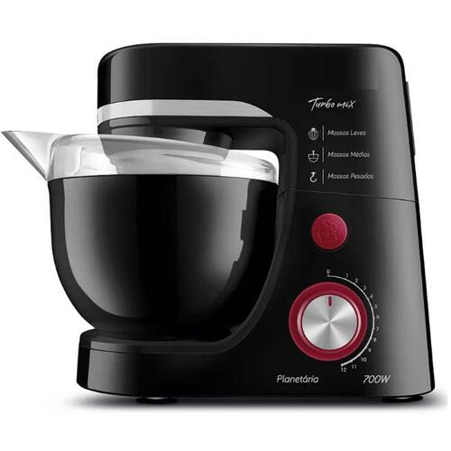 Ficha Técnica: Cor: Preto/Vermelho Tipo de batedeira: Batedeira Planetária Voltagem (Tensão): 220V Número de velocidades: 12 velocidades Capacidade em litros: 4,5L Material: ABS Tipo de tomada: 10A Alimentação: Energia Elétrica Potência: 700W Tipo de batedores: Para massas leves, médias e pesadas Quantidade de tigelas: 01 Comprimento do cabo: 1,50m Peso: 3,900kg Dimensões do produto: 33,50cm x 17cm x 38cm (AxLxP) Itens inclusos: 01 Batedeira; Manual de Instruções Garantia: 01 ano Marca: Não Informado