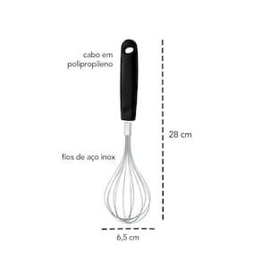 Batedor de claras manual. O Batedor Fouet com fios de ao inox tem mais durabilidade, e o cabo com detalhe de apoio, proporciona maior firmeza e segurana no manuseio. Possui furo passante para pendurar o utens’lio tornando o armazenamento mais pr‡tico e bem organizado.Ê Ê Contm: 1 Batedor de Claras Dimens‹o: 28 x 6,5 cm Material: ao inox e polipropileno
