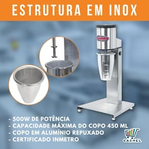 Batedor de Milk Shake profissional da Bermar, esse batedor possui um potente e resistente motor de 500 W que te ajudar a bater sorvete expresso e sorvete de balde, que são mais duros. Possui estrutura confeccionada em aço inoxidável 430 e copo em alumínio repuxado e polido com 3 níveis: 100 ml, 250 ml e 450 ml.