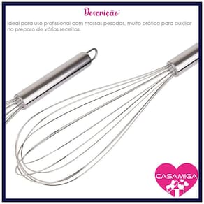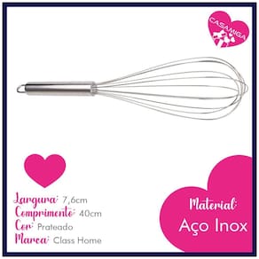 Batedor de Ovos Fuê Fouet Inox 40cm Massa Bolo Ideal para com massas pesadas, muito prático para auxiliar no preparo de várias receitas. Feito inteiramente em inox é fácil de higienizar, é atóxico, não altera o sabor dos alimentos, além de ser muito resistente. Características: - Largura: 7,6cm - Comprimento: 40cm - Material: Aço Inox - Cor: Prateado - Marca: Class Home - Conteúdo: 1 Batedor Medidas aproximadas. Imagens meramente ilustrativas. Somos a CASAMIGA, uma loja especializada em utilidades doméstica e decoração. Aqui você encontra as tendências em primeira mão Marca: Não Informado