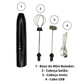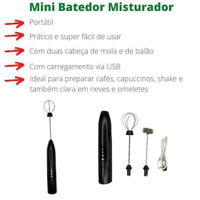 O Mini Batedor é produzido de aço inoxidável 304 de qualidade alimentar e ABS. A bateria de lítio embutida recarregável é poderosa e pode ajudá-lo a tornar as coisas mais rápidas e eficientes. Você pode fazer uma deliciosa xícara de café com leite cheia de espuma em cerca de 30 segundos. O mini batedor conta com duas cabeças destacáveis sendo a cabeça de mola para fazer espuma de leite e café e a cabeça de balão para bater ovos e claras em neve. Por isso é fácil para você trocar, limpar e armazenar. É muito fácil operar o batedor de leite/ovos: basta pressionar o botão do interruptor uma vez para acionar cada estágio de velocidade.--------------------Especificações Técnicas:Material: Aço Inoxidável 304; Fonte de Energia: Recarregável Portátil ; Potência Nominal: 4w; Tensão de Entrada Nominal: 5V; Corrente de Entrada Nominal: 1A; Estágios de engrenagem:1 x - baixa velocidade: ideal para bater ovos, leite;2 x - média velocidade: ideal para alimentos semi pastosos;3 x - alta velocidade: ideal para bater claras em neves e alimentos mais pastosos;Para desligar o eletro pressiona o botão do interruptor por 02 segundos e a energia será desligada.--------------------Itens Inclusos:01 x base do mini batedor; 1 x cabeça de mola; 1 x cabeça de balão; 1 x Cabo USB;--------------------Trabalhamos com produtos de qualidade, sempre oferecendo o melhor suporte e produtos para todos os nossos clientes.Qualquer dúvida nos envie uma mensagem.