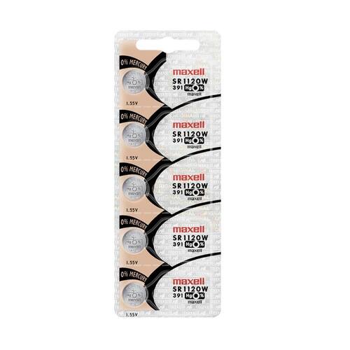 Bateria para relógio de pulso Maxell 391 / SR1120W, excelente qualidade e durabilidade Utilizada em relógios Fabricação no Japão Marca Maxell Modelo 391 Tamanho da pilha SR1120W Forma Botão Formato de venda Cartela Unidades por kit 1 Un Tamanho: Largura 11.6mm, altura 2.05mm Tensão V : 1.55V Corrente A : 55mAh Química: Óxido de Prata É recarregável: Não Embalagem 3 Meses Marca: Não Informado