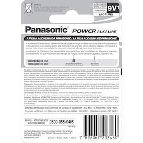 Bateria Alcalina 9v 6lf22xab/1b24 Informações do produto: A Bateria Alcalina 9V Panasonic oferece uma fonte confiável e duradoura de energia para diversos dispositivos eletrônicos. Ideal para uso em equipamentos como alarmes de segurança, controles remotos, e dispositivos de medição, esta bateria alcalina garante um desempenho consistente e prolongado. Com tecnologia avançada, ela proporciona uma alta capacidade de energia e uma vida útil superior, além de ser resistente a vazamentos. Características: Tipo: Bateria alcalina Voltagem: 9V Uso: Ideal para alarmes, controles remotos e dispositivos de medição Durabilidade: Alta capacidade e longa vida útil Resistência: Resistente a vazamentos