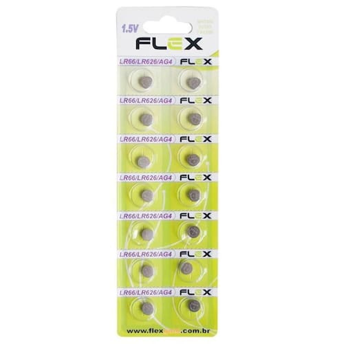 Bateria botao lr66 cartela com 14 pcs flex fx-lr66 Bateria botao lr66 cartela com 14 pcs flex fx-lr66 A bateria botão flex fx-lr66 é uma célula alcalina de 1,5v, amplamente utilizada em dispositivos eletrônicos de pequeno porte, como relógios, calculadoras e brinquedos. Cada cartela contém 14 unidades, oferecendo uma solução econômica e prática para reposição de baterias. Especificações principais: - modelo: lr66 também conhecida como ag4, lr626, sr626, 177, 377 . - voltagem nominal: 1,5v. - composição química: alcalina. - formato de venda: cartela com 14 unidades. Observações: As baterias não são recarregáveis; descarte-as de maneira adequada após o uso. Verifique a compatibilidade com seu dispositivo antes de utilizá-las. Marca: Não Informado Ean: 7908417101903