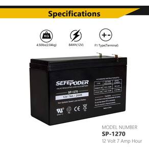 Sefepoder As baterias de grafite-ácido reguladas por válvula são feitas de materiais de alta qualidade com algodão absorvente adicionado dentro da bateria para evitar vazamento de líquido. - ?Tipo?: Bateria de grafite-ácido selada de 12 volts 7 Amp 20 horas (SLA), terminais tipo "F1" - ?Tamanho?: 15.1 cm X 6.5 cm X 10.0 cm - ?Parâmetros?: SP-1270 Sla é uma bateria recarregável de 12V 7Ah, livre de manutenção e válvula antiderramamento regulada. - ?Instalação?: Fácil de instalar, resistente a choques e vibrações, duradouro e durável. - ?Compatibilidade?: Amplamente utilizado na maioria dos campos, como: iluminação de emergência, roteador de 12 V, alto-falantes, brinquedos de equitação, rodas elétricas, localizador de peixes, backup de pequenos ups, rádio amador, alarme doméstico, aplicações fora da rede etc.
