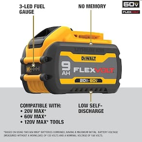 Obtenha energia para seus trabalhos mais exigentes com a bateria FLEXVOLT 20V/60V MAX* 9Ah. Compatíveis com ferramentas de 20V MAX*, 60V MAX* e 120V MAX*, essas baterias apresentam tecnologia patenteada que muda automaticamente a voltagem quando você troca suas ferramentas. Projetada para funcionar com menos temperatura do que a bateria de 9 Ah da principal concorrente, essa bateria oferece até 6 vezes o tempo de execução** quando usada em ferramentas de 20V MAX*.