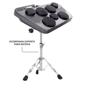 Com saídas P10, entrada auxiliar, fone de ouvido e MIDI, funciona como um estúdio portátil, podendo ser conectada a pedais de Hi-Hat e Bumbo para ampliar o setup. É a escolha ideal para quem busca praticidade, evolução musical e liberdade de tocar em qualquer ambiente.