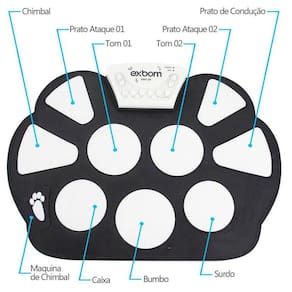 Bateria eletrônica portátil instrumento musical em silicone dobrável emt-s9 Quem se interessa por instrumentos musicais sabe que uma das dificuldades de sua aquisição, além de normalmente seus preços elevados, é seu tamanho. Geram problemas logísticos como: onde guardá-los Como transportar de um lugar a outro Entre outros... Foi pensando nisso que foi desenvolvida a bateria elétrica acessível e portátil. Seu material em silicone  Dobrável possibilita armazenar a bateria, pedais e baquetas de forma compacta, facilitando muito nas questões logísticas de onde e como guardar ou transportar. A bateria conta com dois pedais e funciona alimentada via uma porta usb 5v ou por meio de duas pilhas palito aaa , o que possibilita que você toque em qualquer lugar. Atenção: o aparelho não é equipado com alto-falantes, portanto, é necessário o uso de fones de ouvido ou caixa de som que possibilite que você ouça o som.