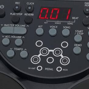 • 7 pads sensitivos + 2 pedais; • Modo para tocar com baquetas ou com as mãos; • 265 sons de percussão e 128 sons GM; • 45 kits de bateria / 5 usuário; • USB MIDI; • Entrada auxiliar; • Funciona com 6 pilhas C ( médio ); • Peso 3.3kg; • Compatível com V-Drums Friend Jam; • Vozes: 265 vozes de percussão e 128 vozes GM; • Kits: 50 Kits editáveis (45 kits prontos de fábrica + 5 Kits de usuário); • Acompanhamentos: 100 Acompanhamentos (80 estilos + 20 músicas); • Funções: Reverb, Gravador de performance, Metrônomo com dois sons diferentes; • Display: Led de 3 dígitos; • Conectores: Porta USB Host, Entrada Auxiliar conector P10 estéreo, Saída de áudio para fones de ouvido ou caixa de som conector P10 estéreo, Input para pedal de bumbo e pedal controlador de chimbal (incluso); • Acompanha Par de baquetas; • Garantia de 1 ano; • Imagens meramente ilustrativas.