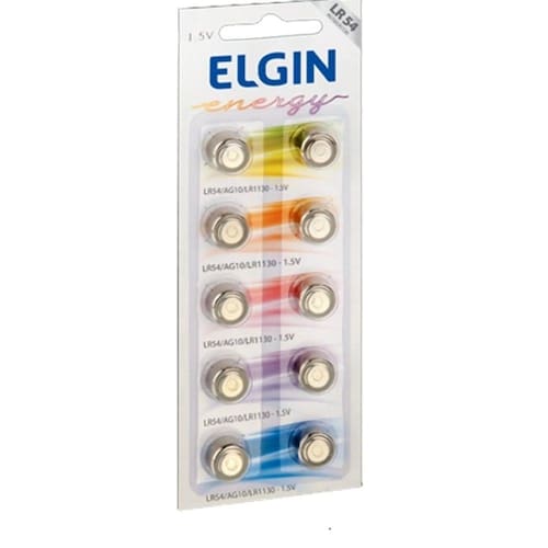 Marca: Elgin Categoria: Lr54 Equipamentos compatíveis: Equipamentos que requerem descargas de energia leves e contínuas. EX: Relógios, brinquedos, rádios. Conteúdo da embalagem: Cartela com 10 Baterias Voltagem (volts): 1.5V Peso liq. aproximado da embalagem com produto (Kg): 18g