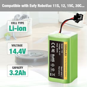 -?Bateria de longa duração de 3,2 Ah?: 14,4 V | Lítio | Capacidade atualizada de 3,2 Ah. Mesmo tamanho e função do Eufy Robovac Battery Replacement 11s, fácil de instalar, se encaixa perfeitamente e funciona bem. A carga total pode durar cerca de 120 a 180 minutos.