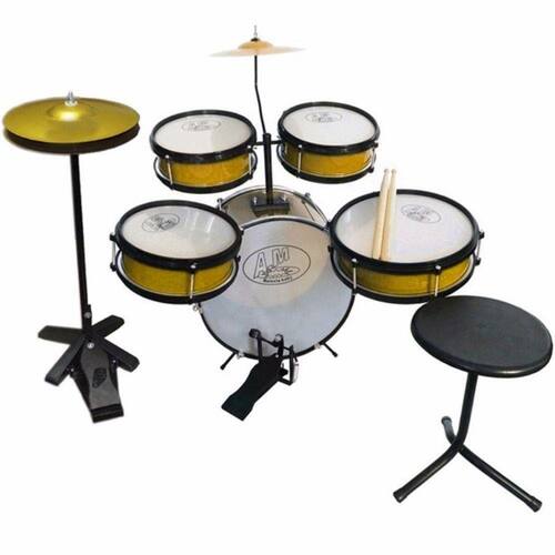 Segue o que acompanha: 1 bumbo; 1 caixa; 2 tom; 3 prato de ferro pintado; 1 surdo; 1 banco; 1 pedal; 1 suporte do tom e prato; 1 pé do surdo; 1 par de baquetas; 1 máquina de chimbal Peso: 8 kg. Dimensões (l x a x p): 45 x 60 x 40 cm Intensidade do som produzido: 30 decibéis. Indicado para crianças de 3 a 8 anos Cor: Dourado