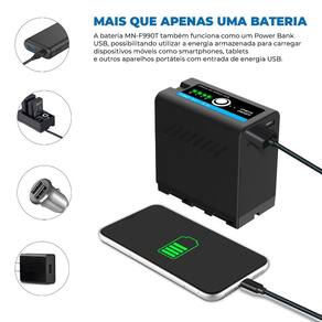 Além de fornecer energia para seus equipamentos, o MN-F990T também funciona como um Power Bank USB, possibilitando utilizar a energia armazenada na bateria para carregar dispositivos móveis como smartphones, tablets e outros aparelhos portáteis com entrada de energia USB.