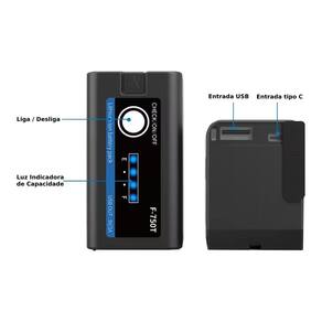 Com 5000 e 7.4v 2. Possui uma saída usb de 1.5a que suporta carregamento rápido para alimentar seu smartphone, tablet, power banks, ou outros dispositivos usb. Sua a entrada usb-c type-c de 5v / 2a que pode ser usada para carregamento da bateria com qualquer fonte de alimentação. A capacidade da bateria np-f750t pode ser verificada rapidamente através do medidor led de 4 segmentos que mostram o nível da bateria 25%,50%,75%,100% .