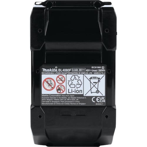 Bateria xgt 40v max 8.0ah bl4080 makita 191x65-8 A bateria mantém a carga ociosa por longo período, ela é resistente a quedas, recarga rápida.Possui indicador de nível de carga, bateria de íons de lítio, sem efeito de memória. Comunicação digital entre a ferramenta e a bateria para desempenho otimizadoA carcaça da célula para serviço pesado melhora significativamente a resistência ao impacto das bateriasO sistema de ventilação da bateria maximiza a vida útil da bateriaA estrutura de prevenção de curto-circuito protege os terminais contra poeira e umidadeA proteção contra umidade de 3 camadas protege as células da entrada de água Especificações técnicas:Modelo: bl4080Voltagem: 40vAmperagem: 8ahCapacidade de energia: 288whTempo de carga: 76min Imagens meramente ilustrativas