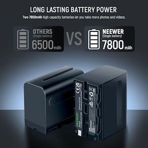 NEEWER NP-F970 2 peças 7800mAh baterias de substituição com carregador rápido LCD Dual USB, compatível com Sony NP-F970 F960 F950 F770 F750 F570 F550, Handycam, luz LED NEEWER, monitor, controle - ?Ampla compatibilidade? Compatível com baterias Sony NP-F550, NP-F570, NP-F750, NP-F770, NP-F960, NP-F970 e NP-F975. Uma bateria para painel de luzes Neewer LED, monitores de campo, controles deslizantes de câmera sem fio e compatível com filmadoras Sony Handycam - ?Carregamento duplo da bateria? Você pode carregar duas baterias NP-F compatíveis simultaneamente colocando-as no carregador corretamente. O carregador rápido de bateria npf tem um LCD que permite que você saiba o status de carregamento em tempo real - ?Carregamento rápido? A porta USB C suporta carregamento rápido, usando um carregador Quick Charge 2.0/3.0 que pode produzir 9V 2A para carregar rapidamente uma bateria NP-F970 a 1,5A ou duas baterias NP-F970 a 1A. NOTA: O carregamento simultâneo através das portas de entrada micro USB e USB C NÃO é suportado - ?2 baterias de substituição atualizadas de 7800 mAh? A bateria de lítio recarregável NP-F970 possui alta capacidade (7,2 V 7800 mAh 56,16 Wh) e oferece uma vida útil mais longa do que as baterias NP-F comuns. Fabricado com células premium, pode fornecer energia de bateria abundante e consistente para capturar todos os momentos maravilhosos da vida - ?Sistema de proteção confiável? O kit de bateria é projetado com um sistema de proteção avançado para evitar efetivamente sobrecarga, curto-circuito, superaquecimento, sobrecorrente, sobretensão e outros perigos potenciais
