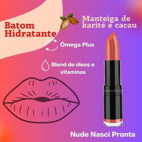 O Batom Hidratante Nude Nascí Pronta, com 3,3g, é um produto de maquiagem projetado para realçar a beleza natural dos lábios. Sua tonalidade nude oferece uma aparência discreta e elegante, ideal para diversas ocasiões, desde o dia a dia até eventos mais formais.