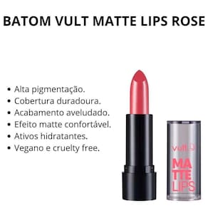 Batom Vult Matte Lips com acabamento matte aveludado. Sua textura confortável tem alta pigmentação e alta cobertura duradoura.O Batom Vult Matte Lips apresenta fórmula enriquecida com Vitamina E, Pantenol e Óleo de Rícino, ativos hidratantes que deixam o efeito matte confortável nos lábios. Sua composição apresenta Tecnologia Real Color: alta pigmentação e cores fiéis da embalagem à sua pele, além, é claro, de ser vegano e cruelty free.