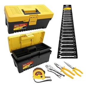 Caixa de Ferramentas Plastica + Jogo de Chaves Combinadas 6 a 22mm, Trena e Alicates