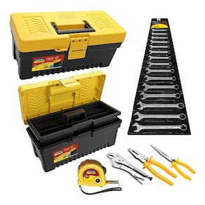 Caixa de Ferramentas Plastica + Jogo de Chaves Combinadas 6 a 32mm, Trena e Alicates