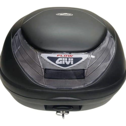Baú Givi Monolock Flow com capacidade para até 35 litros. Desenvolvido em design compacto e moderno, além de possuir trava altamente segura por meio de chaves, que acompanham o produto, possui um grande refletor, aumentando a visibilidade da motocicleta. A aplicação é feita sob o bagageiro utilizando a base de instalação, que acompanha o baú, garantindo seu encaixe seguro.